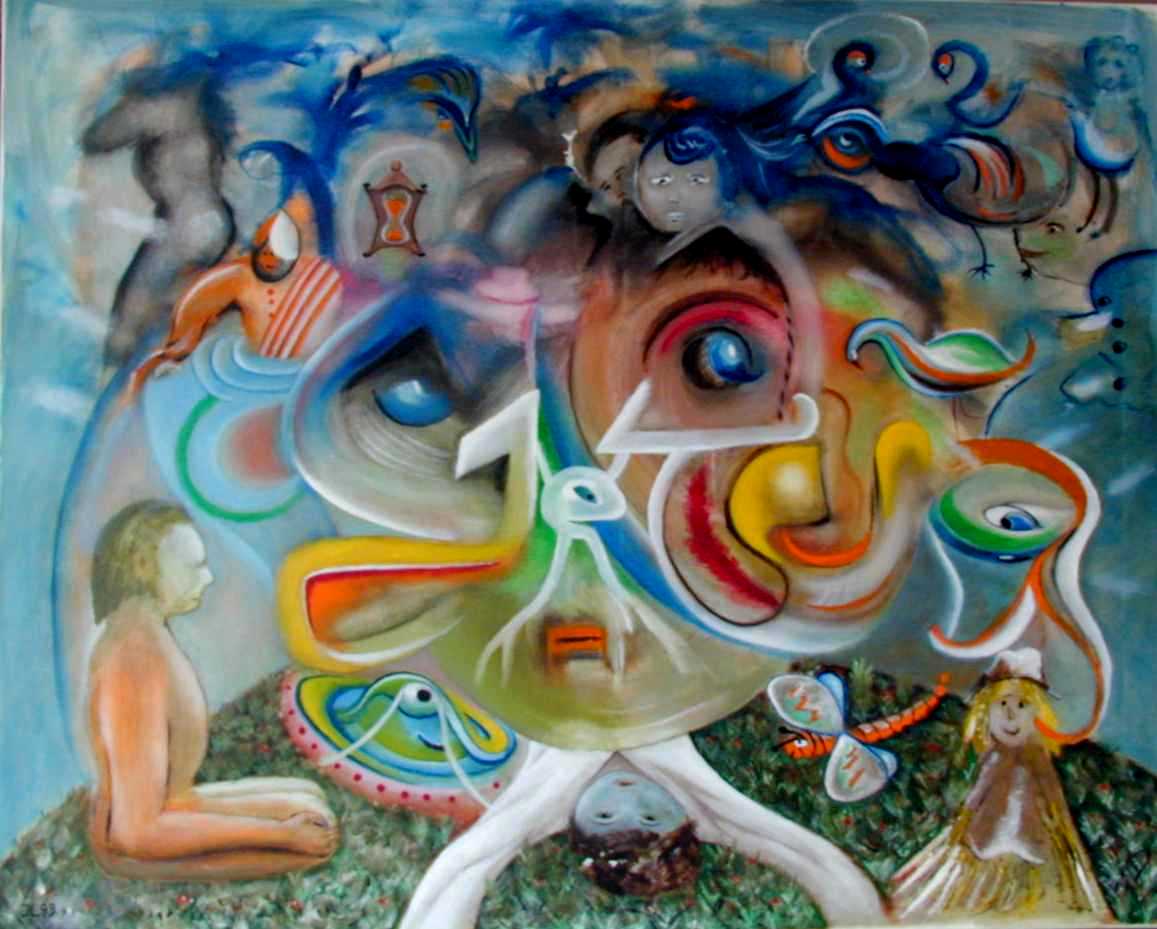 Leinwand, 100cm*80cm Dieses Bild habe ich während des Kosovo-Krieges 1998-1999 gemalt. Es war als ein Schrei gedacht, als eine Anklage. Wie konnten Menschen sich das nur antun?! - Der Junge, der mit ausgestreckten Armen fassungslos in den Himmel blickt, ruft; "O Gott, ist das unsere Welt?" Links neben ihm sitzt ein alter Mann als Verkörperung des Weisheit, rechts neben ihm sieht man eine Puppe als Verkörperung der Kindheit. Direkt über ihm ist ein unergründliches Gesicht zu erkennen: Zwei leere Augen und ein verschlossener Mund. - Es gibt eben keine Antwort auf diese Frage..(s.auch mein Ölbild 'Krieg' in www.lieberoth.de) |